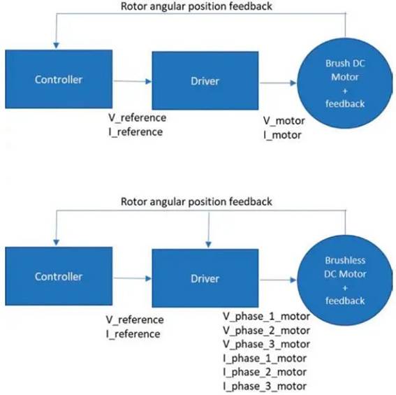 圖 5:有刷直流電機(jī)和無(wú)刷直流電機(jī)之間的運(yùn)動(dòng)控制架構(gòu)比較。