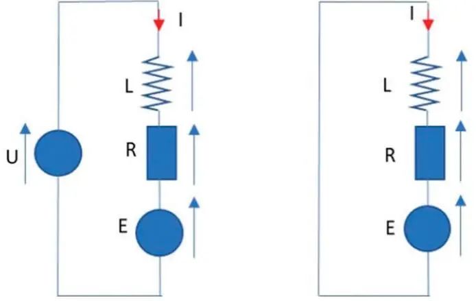 直流電機(jī)的特點(diǎn)是電感L、電阻R 和反電動(dòng)勢(shì)E 串聯(lián)。反電動(dòng)勢(shì)是由磁感應(yīng)(法拉第- 楞次感應(yīng)定律)產(chǎn)生的電壓,它與施加的電壓相反,并且與電機(jī)速度成正比。圖8 顯示了PWM 接通和PWM 斷開(kāi)時(shí)的電機(jī)。