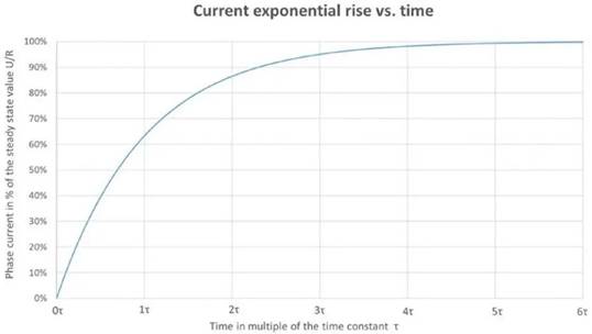 現(xiàn)在,為了簡(jiǎn)單起見(jiàn),我們不考慮反電動(dòng)勢(shì)。當(dāng)向R L 電路施加電壓或切斷電壓時(shí),電感器將阻止電流的變化。向R L 電路施加電壓U,電流將遵循一階指數(shù)上升,其動(dòng)態(tài)取決于由L / R 比決定的電時(shí)間常數(shù)τ(圖9)。在經(jīng)過(guò)5 倍時(shí)間常數(shù)后,它將逐漸達(dá)到穩(wěn)態(tài)值,即99.7%的U/R。