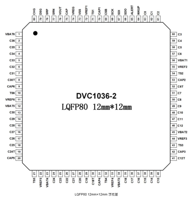 DVC1036是一款采用車規級高壓 BCD 工藝設計的多節鋰電池組監控芯片,通過四線式SPI接口與上位機進行通信,形成一套完整的電池組管理系統(BMS)。 DVC1036內置6路15位ΣΔADC(VADC)和1 路16 位ΣΔADC(CADC),可以持續地高精度測量電池組中電池電壓、電池溫度和充/放電 電流等信息,反饋給上位機完成電池組SOC估算。 DVC1036集成了完整的硬件保護功能,上位機可以將電池過壓閾值、電池欠壓閾值、充電過流閾值、放電過流閾值和放電短路閾值配置到芯片寄存器中。芯片就可以在異常發生時,瞬間完成硬件保護,并立即反饋警報給上位機。 DVC1036內置了36路電池被動均衡驅動電 路,上位機可以同時打開所有電池均衡,而不用擔心影響芯片的硬件保護功能。 DVC1036還集成低邊充電和放電N型場效應管驅動,上位機可以通過配置寄存器完成充電或放電管理。同時芯片在異常發生時,也可以自動關閉充電或放電場效應管,保證電池組安全。
