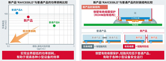 新產品采用融入了ROHM自有IC工藝的晶圓級芯片尺寸封裝*2DSN1006-3(1.0mm×0.6mm),在實現小型化的同時還降低了功耗。與相同封裝的普通產品相比,表示導通損耗和開關損耗之間關系的指標(導通電阻*3×Qgd*4)改善了20%左右,達到業內先進水平(1.0mm×0.6mm以下封裝產品比較),非常有助于縮減各種小型設備電路板上的元器件所占面積并進一步提高效率。另外,還采用ROHM自有的封裝結構,使側壁有絕緣保護(相同封裝的普通產品沒有絕緣保護)。在受空間限制而不得不高密度安裝元器件的小型設備中,使用這款新產品可降低因元器件之間的接觸而導致短路的風險,從而有助于設備的安全運行。