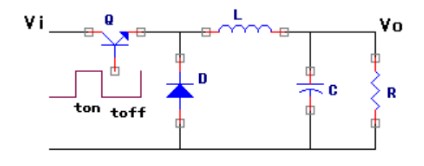 下圖所示是晶體管開關變換器(buck)電路,其中晶體管Q為開關器件,L為濾波電感,C為濾波電容,D為續流二極管。