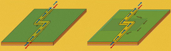 上圖為由于PCB參考地不完整造成的不可預期回流路徑增大環路面積