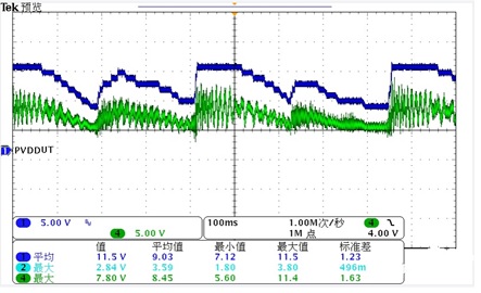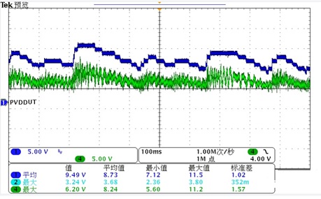 下圖來展示一下ACM3108,在CLASS H功能下,PVDD的變化。下圖藍(lán)色是DCDC的PVDD,綠色是音頻輸出信號。