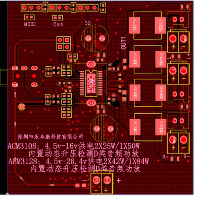 ACM3108 2×25W, 1% THD+N, 16V, 4Ω, BTL ; 1×50W, 1% THD+N, 16V, 2Ω, PBTL AD52068/TPA3110 TSSOP-28 4.5V-16V 動態(tài)調(diào)整升壓CLASS H功能、25W雙聲道/50W單聲道D類音頻功放IC