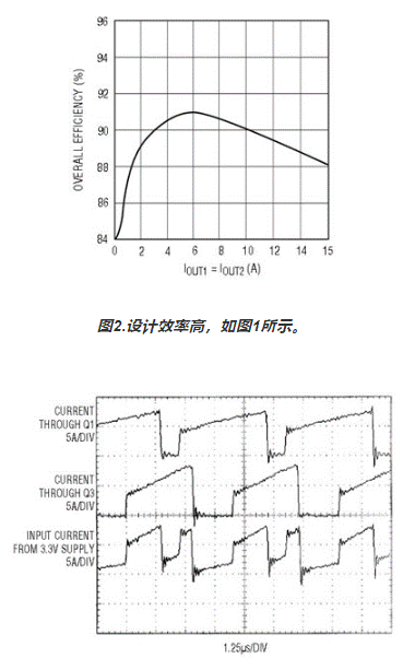 圖1.LTC1876 設計可在 15A 和 15A 時將 3.3V 轉換至 2.5V,在 15A 時轉換 1.8V。
