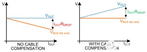 位于中控臺上或后排乘客座椅附近的 USB 端口使用長電纜連接到電源轉換器的輸出。該電源轉換器存在于儀表板的信息娛樂主機中。充電時,在 USB 插座上的電纜末端觀察到壓降,因為這些電纜的電阻有限。例如,輸出電壓為5V,電流為5A,在100m?電纜在插座處具有 500mV 壓降。這違反了USB (3.0)標準,該標準要求連接器電壓在±250mV范圍內(±5%)。在負載瞬變期間以及器件連接或斷開時,插座上觀察到較大的電壓擺幅。通過實施壓降補償可以解決這個問題,其中功率轉換器的輸出電壓與輸出電流成比例增加,如圖4所示。控制方案包括正反饋,其中電壓增加以增加電流,這經常出現穩定性挑戰。這種方法用于補償由于PCB走線和連接器的電阻引起的壓降。這在設備端提供了準確的充電電壓。此外,增加一個檢測電阻以檢測輸出電流會產生額外的壓降和功率損耗。此外,壓降補償在負載瞬變期間引入較大的壓降。長電源線除了電阻外,還包括電感,這會導致快速負載瞬變期間的壓降很大。