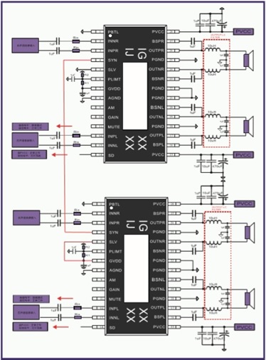 3、IU5706支持12V升壓至24V,給兩顆IU8689供電,輸出4x65W/4歐 ( THD+N=1%);IU8689主從模式可實現多顆芯片無限級聯功率輸出,此應用非常適合車載音頻后裝市場。