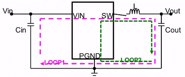下圖中紅色LOOP1為DC-DC高邊管導(dǎo)通,低邊管關(guān)閉時(shí)的電流流向;綠色LOOP2的為高邊管關(guān)閉,低邊管開(kāi)啟時(shí)的電流流向;