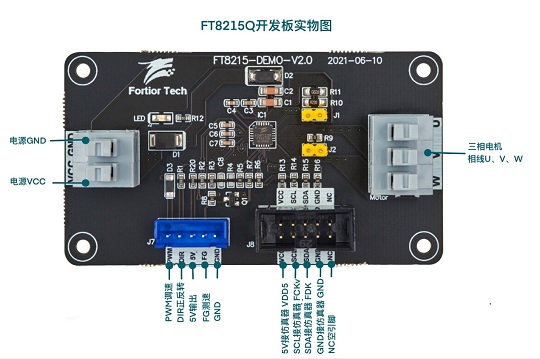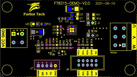 FT8215Q開發板是為開發者而設計的專用測試板,開發板留有電源接線端、U/V/W接線端、仿真器插座、各功能接口。開發者可仿真調試電機和通信燒錄IC,以及測試PWM/VSP調速、正反轉控制、FG測速等功能。