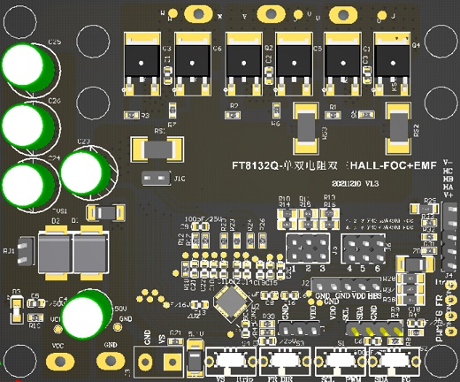 基于FT8132Q三相電機控制專用IC為開發者提供的測試板,設計了MOSFET驅動電路,各種電流電壓檢測電路,HALL輸入電路,以及各類功能接口電路。可實現三相電機的無感FOC驅動,有感FOC驅動,有感SVPWM驅動,支持恒轉速、恒電流、恒功率、電壓環控制模式,支持模擬電壓、PWM、I2C、CLOCK調節電機轉速,支持 HALL、BEMF 檢測,還可實現轉速的實時反饋和電機的控制,以及各類應用方案開發的前期預研;
