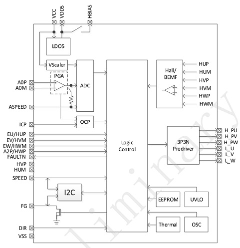 FT8215Q內置多個功能模塊:系統時鐘(OSC)、ADC采樣、I2C通信、5V穩壓(LDO)、電流采樣(VScaler)、過流保護(Over Current)、過溫保護(Thermal)等模塊。外置引腳有U/V/W驅動輸出、SPEED/APSEED調速、FG輸出、正反轉DIR控制等。