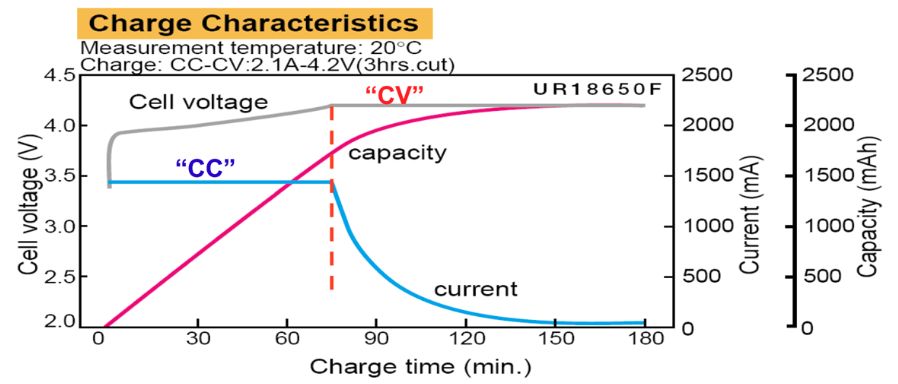 使用類似BQ4725A這類集成的充電管理芯片方案對鋰電池充電其實(shí)十分簡單。鋰電池直接連接到充電控制芯片BQ24725A的BAT管腳上,配置充電控制芯片的Charge Voltge,Charge Current,以及保護(hù)功能的Input Current Limit,使能充電功能即可。Charge Voltage(VCHG)是電芯的最大滿充電壓,Charge Current (ICHG) 是電芯允許的最大充電電流。典型的鋰電池充電特性如下圖所示,分為CC(Constant current)和CV(Constant Voltage) 兩個階段。CC階段恒定以最大充電電流持續(xù)對電池進(jìn)行充電,此時單位時間充入電池的電量是恒定的Q=ICHG*T。隨著電池充入電量越來越多,電池電壓會上升,當(dāng)電壓上升到最大滿充電壓時候,充電芯片將控制輸出電壓為恒定的最大滿充電壓,此時電流開始逐漸減小,充入電量的增加速度慢慢減慢,總充入電量仍然在增加。直到電流減小到截止電流點(diǎn),充電芯片停止充電,鋰電池達(dá)到充滿狀態(tài)。