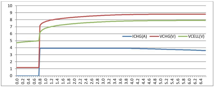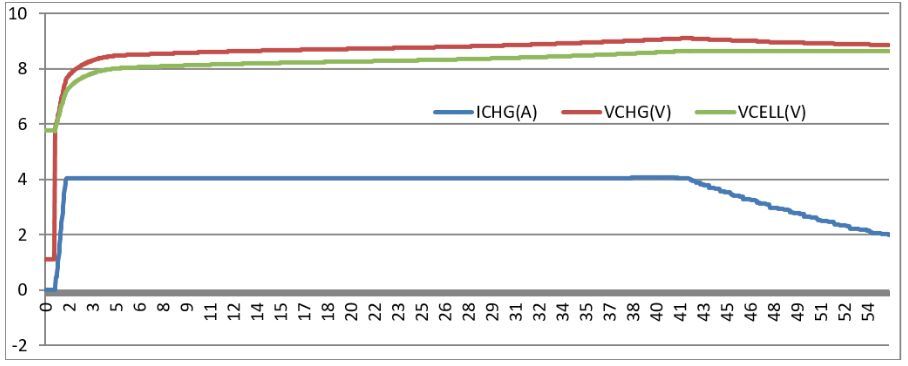 基于這個管理過程,使用充電芯片BQ24725A對一塊對講機(jī)電池(滿充電壓8.8V)進(jìn)行充電,并記錄下充電過程中的VCHG, ICHG和VCELL(電芯側(cè)的電壓)。下圖所示為基于橫坐標(biāo)的充電時間(分鐘)對應(yīng)的各個參數(shù)的變化趨勢,可以看到在不到第五分鐘,VCHG就達(dá)到最大值,ICHG就從峰值的4A電流開始下降,經(jīng)歷了從CC區(qū)間到CV區(qū)間的切換。最大充電速率的CC階段4A充電持續(xù)時間很短,可以預(yù)料,如果要對這塊電池完全充滿,CV區(qū)間將耗費(fèi)很長的時間。