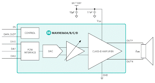 與舊的D類放大器不同,該IC使用自動采樣率和位深度配置,無需復雜的編程,并提供簡單有效的“即插即用”音頻解決方案。它具有靈活的音頻接口,支持I2S、左對齊和 8 通道時分復用 (TDM) 數據格式。它接受 8kHz、16kHz、32kHz、44.1kHz、48kHz、88.2kHz 和 96kHz 采樣速率,I中的數據字可以是 16 位、24 位或 32 位2S 和左對齊模式以及 TDM 模式下的 16 位或 32 位。10μV 保證了高品質音頻有效值輸出噪聲、80dB PSRR 和 110dB 動態范圍規格,對于揚聲器靠近耳朵的設備(例如 AR/VR 和可穿戴設備)以及在安靜環境中使用的設備(睡眠輔助設備)來說,這些規格尤其重要。
