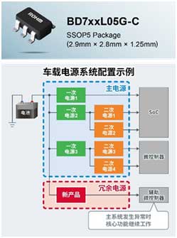 新產品BD7xxL05G-C系列不僅滿足車載產品125℃工作和AEC-Q100汽車電子產品可靠性標準等要求,還滿足車載冗余電源所需的小型封裝尺寸和低耗電量等基本需求。而且,新產品雖然體積小巧,卻可作為一次電源(輸入額定電壓:45V)使用,目前,ROHM正在擴展相應的產品陣容,以方便客戶可以根據各種微控制器和傳感器等后級器件進行選用。