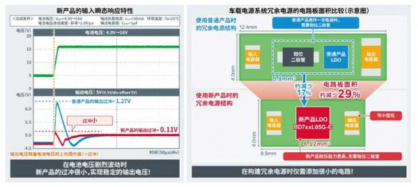 新產品不僅體積小巧(2.9mm×2.8mm),還實現了高耐壓(Max.=45V)和低消耗電流(Typ.=6μA),可滿足構建需要持續工作的冗余電源時的主要需求。另外,利用ROHM擅長的模擬控制技術,使得在電池電壓劇烈波動的情況下也能確保穩定的輸出電壓。在相同條件下進行比較時,普通產品會出現最大超過1.2V的過沖,因此需要通過添加大容量輸出電容器等方法來防止電壓超過輔助微控制器等后級器件的額定電壓。新產品的過沖僅為0.1V左右,因此支持輸出電容器的小型化。與使用普通產品的冗余電源電路相比,使用新產品時電路板面積還可縮減約29%,從而能夠通過添加更小規模的電路來構建冗余電源。此外,新產品還具有出色的抗干擾能力,在ISO 11452-2輻射抗擾度測試中,輸出電壓在測試范圍內的各個頻段幾乎都沒有波動,從而有助于減少應用產品設計時的抗噪對策工時。