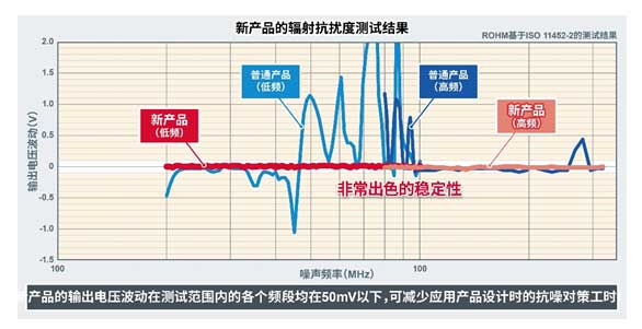 不僅如此,新產品還具有出色的抗干擾能力,在 ISO 11452-2輻射抗擾度測試(用來評估抗干擾能力的國際標準)中,在測試范圍內的各個頻段,輸出電壓波動量均在50mV以下(±1%以內),因此可以減少應用產品設計時的抗噪對策工時。