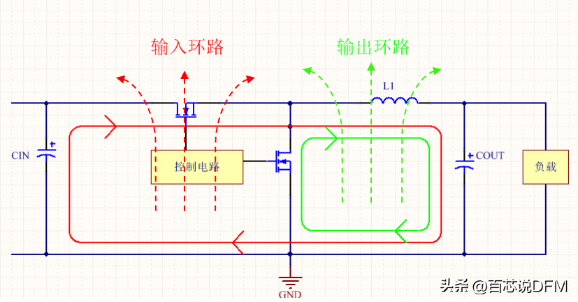 DC-DC芯片布板需遵循一個(gè)非常重要的原則,即開關(guān)大電流環(huán)路面積盡可能小。下圖所示的BUCK拓補(bǔ)結(jié)構(gòu)中可以看到芯片開關(guān)過程中存在兩個(gè)大電流環(huán)路。紅色為輸入環(huán)路,綠色為輸出環(huán)路。每一個(gè)電流環(huán)都可看作是一個(gè)環(huán)路天線,會(huì)對外輻射能量,引起EMI問題,輻射的大小與環(huán)路面積呈正比。