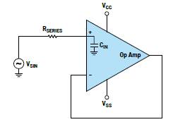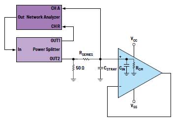 圖1.在運算放大器輸入端增加串聯電阻之后,可以測量運算放大器的輸入電容。