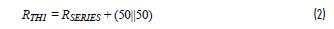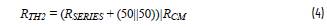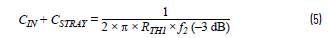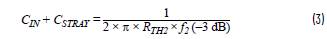其中,f2(–3dB)是使用網絡分析儀,在帶有運算放大器時測量得出的–3dB轉角頻率,RTH2與插入的串聯電阻、輸入端接電阻(50Ω)、功率分配器的輸出電阻(50Ω),以及運算放大器(RCM)的共模輸入阻抗成函數關系: