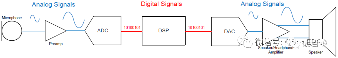 數字音頻接口DAI,即Digital Audio Interfaces,顧名思義,DAI表示在板級或板間傳輸數字音頻信號的方式。相比于模擬接口,數字音頻接口抗干擾能力更強,硬件設計簡單,DAI在音頻電路設計中得到越來越廣泛的應用。圖1和圖2對比傳統的音頻信號和數字音頻信號鏈的區別。