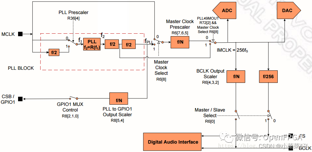 在I2S/PCM接口的ADC/DAC系統中,除了BCLK和FS(LRCLK)外,CODEC經常還需要控制器提供MCLK (Master Clock),這是由CODEC內部基于Delta-Sigma (ΔΣ)的架構設計要求使然。MCLK時鐘頻率一般為256*FS,具體參考特定器件手冊。