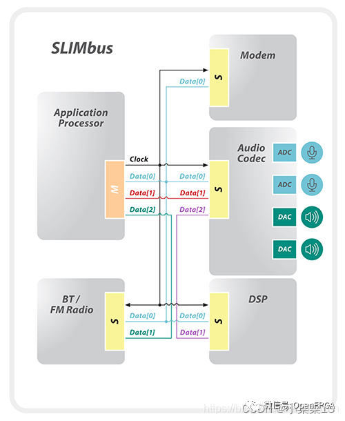 SLIMBUS,全稱 Serial Low-power Inter-chip Media Bus,是MIPI聯盟指定的一種音頻接口,用于連接基帶/應用處理器和音頻芯片,總線協議保證既能發控制信息,又能發數據信息,這樣就可以替換傳統的數據和控制兩種接口如I2S和I2C。SLIMbus v2.0是兩線制,多分支TDM接口,支持多主機和多個設備。它采用以高達28MHz的單數據速率(SDR)運行的CMOS I / O,具有固定的幀大小,支持主控和時鐘切換功能,以實現低功耗操作。SLIMbus v2.0還支持多個多通道,高質量音頻流,相位相干性,以實現立體聲,麥克風陣列和其他引人注目的功能。它還支持每臺設備最多八個通道的可擴展帶寬,以使峰值聚合帶寬最高達到224Mbps。
