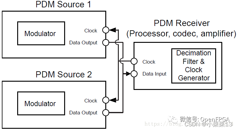 在以PDM方式作為模數轉換方法的應用接收端,需要用到抽取濾波器(Decimation Filter)將密密麻麻的0和1代表的密度分量轉換為幅值分量。PDM方式的邏輯相對復雜,但它只需要兩根信號線,即時鐘和數據。