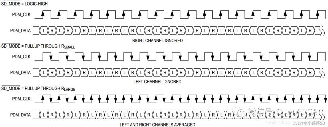 下圖為Maxim的Class-D類型功放MAX98358對PDM接口時序的要求,可以看到它在PDM_CLK的上升沿采樣左聲道數據,在PDM_CLK下降沿采樣右聲道數據。、