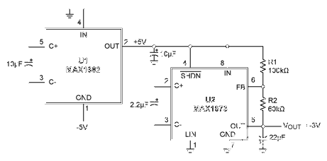 U1 (MAX1682)作為倍壓器工作,接受5V負輸入并產生5V正輸出。穩壓反相器(U2,MAX1673)接受+5V電壓并產生-3V輸出。U2輸出端的分壓器(R1/R2)提供反饋,將U2的輸出電壓調節到所需水平(V外).在FB輸入端,閾值電壓出廠設置為零。您可以使用 R2(5V/R1) = -V 選擇 R1 和 R2 的值外,再加上它們的總和應允許最小電流為 50μA 的條件。V的精度外很大程度上取決于-5V輸入的精度。圖2和圖3顯示了-4.75V、-5V和-5.25V輸入的電路效率和輸出調節。
