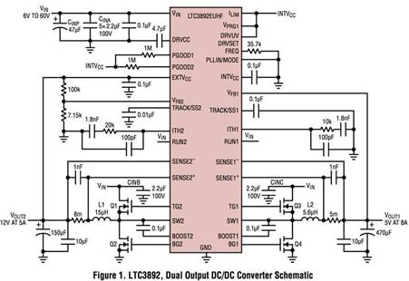 圖 1 顯示了單個 LTC3892、雙輸出解決方案:在 5A 時輸出 12V,在 8A 時輸出 5V。LTC3892 控制兩個電源系,每個都有一對開關 MOSFET、電感器和輸出濾波器。該電路展示了通過對 V PRG1引腳進行編程將 V OUT1  設置為固定電平的能力  。在此示意圖中,它設置為 5V 1;因此,V OUT1  直接連接到 FB1 引腳。通過將 DRVSET 引腳連接到 INTV CC引腳來選擇標準柵極驅動電平  。
