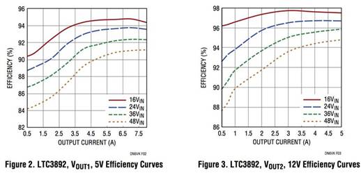 在圖 1 的解決方案中,兩個輸出的 V IN  引腳和頂部 MOSFET 的漏極連接到相同的輸入電壓 V IN。但是,如果需要,這三個端口可以連接到不同的電壓或電源。設計人員可以通過 V IN引腳對 LTC3892 進行偏置  ,并將來自不同源的電壓施加到 Q1 或 Q3 的漏極。圖 2 和圖 3 顯示了圖 1 中的轉換器在各種輸入電壓下的效率。