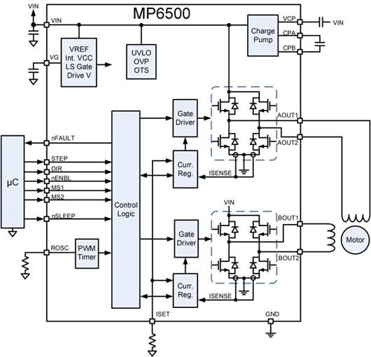 使用 MPS 的MP6500步進(jìn)電機驅(qū)動器 IC進(jìn)行了兩個類似的實驗。MP6500 驅(qū)動器 IC 使用的 PWM 電流調(diào)節(jié),可以從整步到 1/8 步運行。圖 7顯示了 MP6500 的框圖。