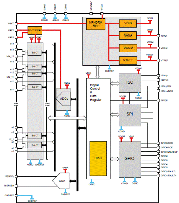 此外,器件中包含的隔離式雙向菊花鏈端口支持通過電容器和變壓器進行隔離,并且能夠使用更高效的組件實現xEV動力總成系統中常見的集中式或分布式架構。在通信線路中斷的情況下,菊花鏈通信接口可配置為環形架構,允許主機與堆棧兩端的設備通信。器件中的8個GPIO或輔助輸入可執行外部熱敏電阻測量。