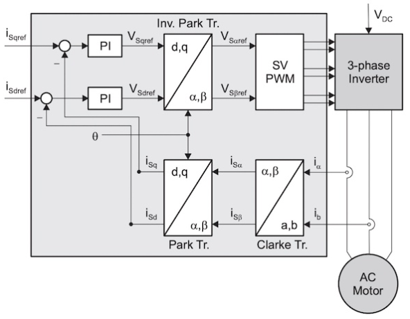 三相逆變器的輸出產(chǎn)生正弦信號,該信號通過克拉克變換和派克變換進(jìn)行采樣和饋送。