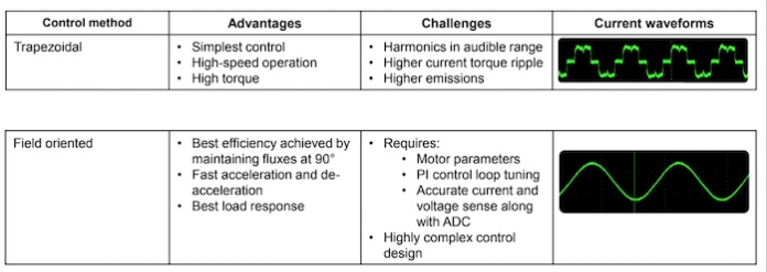 用于控制無刷直流電機(jī)的兩種控制方案各有優(yōu)缺點。每種方法都會產(chǎn)生諧波,從而產(chǎn)生噪聲。