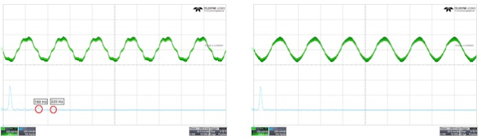 在MCF8316A內(nèi)部啟用死區(qū)時間補償可消除可聽諧波(左),從而產(chǎn)生更純凈的正弦信號(右)。