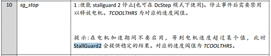 3.將TCOOLTHRS設置為高于TSTEP的值,并啟用sg_stop使能堵轉停止功能。確保電機在停機時安全停止。如果電機在堵轉發生前停止,增加SGT。通過禁用sg_stop或讀并寫入RAMP_STAT寄存器(寫+清除功能)重新啟動電機。