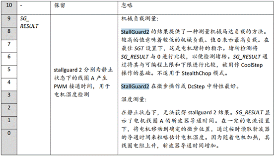 *DRV_STATUS 0X6F: StallGuard2值和驅動錯誤標志0-9bit SG_RESULT(負載值) 用于監測電機所剩的扭力。