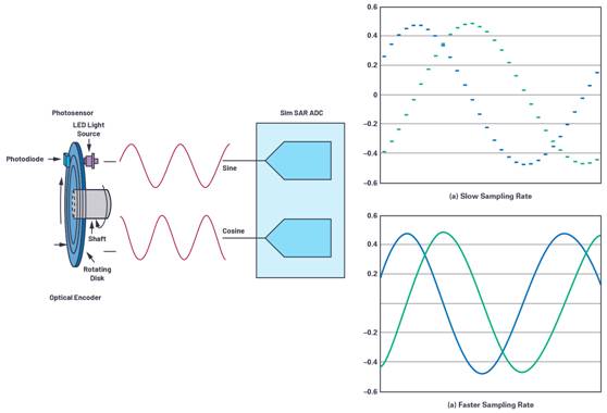 ADC 將使我們能夠創建更高分辨率的編碼器,而無需對編碼器盤進行系統更改。例如,當以較慢的速率對編碼器正弦和余弦信號進行采樣時,捕獲的信號值較少,如圖 3