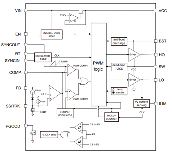 ✦ 穩(wěn)壓器: 為內(nèi)部電路供電,提供內(nèi)部固定參考電壓。該模塊還實(shí)現(xiàn)了電壓監(jiān)測(cè)電路 (UVLO),用于監(jiān)測(cè)輸入電壓和內(nèi)部電壓;