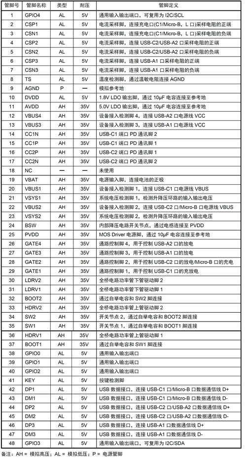 M12266 M12266是一款面向多串電芯大功率移動電源應用的專用SOC,集成了同步升降壓電壓變換器、電池充放電管理模塊、顯示模塊、電量計算模塊,提供最大100W輸入/輸出功率,支持 PD3.0、QC3.0、AFC、FCP、 SCP、BC1.2 DCP等主流快充協議,并提供輸入/輸出的過壓/欠壓、電池過壓/欠壓、過充/過放、NTC 過溫、放電過流、輸出短路保護等完備的保護功能。配合極簡的外圍電路,即可組成100W多口移動電源。 M12269 QFN-48 3.3V-30V 多串單路PD3.0移動電源SOC