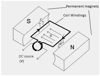 直流電機(jī): 簡(jiǎn)單的直流電機(jī)在軸上使用線圈繞組,帶有固定的永磁體(圖 2)。當(dāng)電壓 (V) 施加到線圈時(shí),電流 (i) 流過(guò)它。由于存在磁場(chǎng) (B),力 (F) 作用在線圈上(根據(jù)弗萊明斯右手定則),使其旋轉(zhuǎn)。一旦線圈到達(dá)永磁體的一個(gè)磁極,它就會(huì)受到排斥力并向另一個(gè)磁極移動(dòng)。這涉及連續(xù)旋轉(zhuǎn),其速度由施加的直流電壓決定。