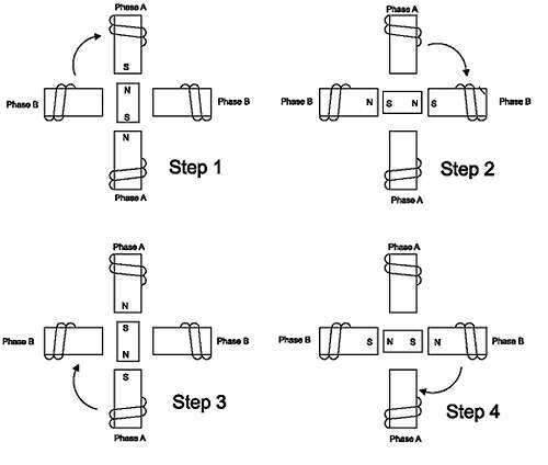 兩相電機(jī)的工作如圖 2所示。在步驟 1 中,兩相定子的 A 相通電。這會(huì)將轉(zhuǎn)子磁力鎖定在所示位置,因?yàn)楫悩O相吸。在步驟2中,A相關(guān)閉,B相開(kāi)啟,使轉(zhuǎn)子順時(shí)針旋轉(zhuǎn)90°。在第 3 步中,B 相開(kāi)啟,但極性與第 1 步相反,導(dǎo)致另一個(gè) 90° 旋轉(zhuǎn)。在步驟4中,A相關(guān)閉,B相打開(kāi),極性與步驟2相反。重復(fù)此順序會(huì)使轉(zhuǎn)子以 90° 的步長(zhǎng)順時(shí)針旋轉(zhuǎn)。