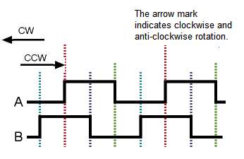 增量編碼器: 使用增量編碼器,只能確定電機(jī)的相對(duì)位置(即,只能確定相對(duì)于先前位置的旋轉(zhuǎn)方向和角度)。增量編碼器發(fā)出兩個(gè)信號(hào),A 和 B,當(dāng)沒(méi)有旋轉(zhuǎn)時(shí),這兩個(gè)信號(hào)都有一個(gè)默認(rèn)值,比如邏輯 0 或邏輯 1。當(dāng)軸上有一個(gè)小角度旋轉(zhuǎn)時(shí),信號(hào) A 和 B 都轉(zhuǎn)換為其他邏輯持續(xù)時(shí)間很短,然后返回到默認(rèn)值。對(duì)于每次這樣的旋轉(zhuǎn),A 和 B 信號(hào)都會(huì)發(fā)生轉(zhuǎn)換。根據(jù)旋轉(zhuǎn)方向,A 中的過(guò)渡會(huì)導(dǎo)致 B 中的過(guò)渡,反之亦然。圖 4 顯示了順時(shí)針和逆時(shí)針旋轉(zhuǎn)的 A 和 B 信號(hào)。