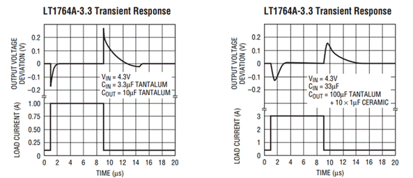 瞬態響應是指電流階躍變化時的輸出電壓變化。它與電容,控制環路的增益帶寬和負載電流變化的大小和速率有關。