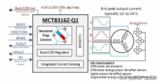 兩個月之后,TI在MCF8316A和MCT8316A兩款BLDC驅動器的基礎上,又推出了MCT8316Z,給驅動12V至24V直流電機的客戶提供了一種單芯片無代碼,并且包含傳感器梯形的選擇。該芯片集成了傳感器梯形控制的三相BLDC電機驅動器,工作電壓絕對最大值為40V,最大輸出電流為8A。MCT8316Z采用的是霍爾傳感器的120°換向,同時支持模擬或者數字霍爾輸入。該器件支持高達200kHz的PWM頻率,同時PWM還支持同步與異步調制。此外,該器件還有車規級版本。
