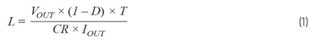 此公式基于電流紋波比CR計算降壓轉換器所需的電感值L。該比值一般指定為0.3,或30%峰峰紋波。在該公式中,D表示占空比,T表示周期時間,取決于各自的開關頻率。
