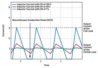 圖2中,紅色線條表示電路的電感電流紋波(電流紋波比(CR)為30%,輸出電流為3A。這是開關穩壓器電路設計中常見的折衷選擇。藍色波形對應的電感電流紋波為133%,綠色波形對應的電感電流紋波為7%。